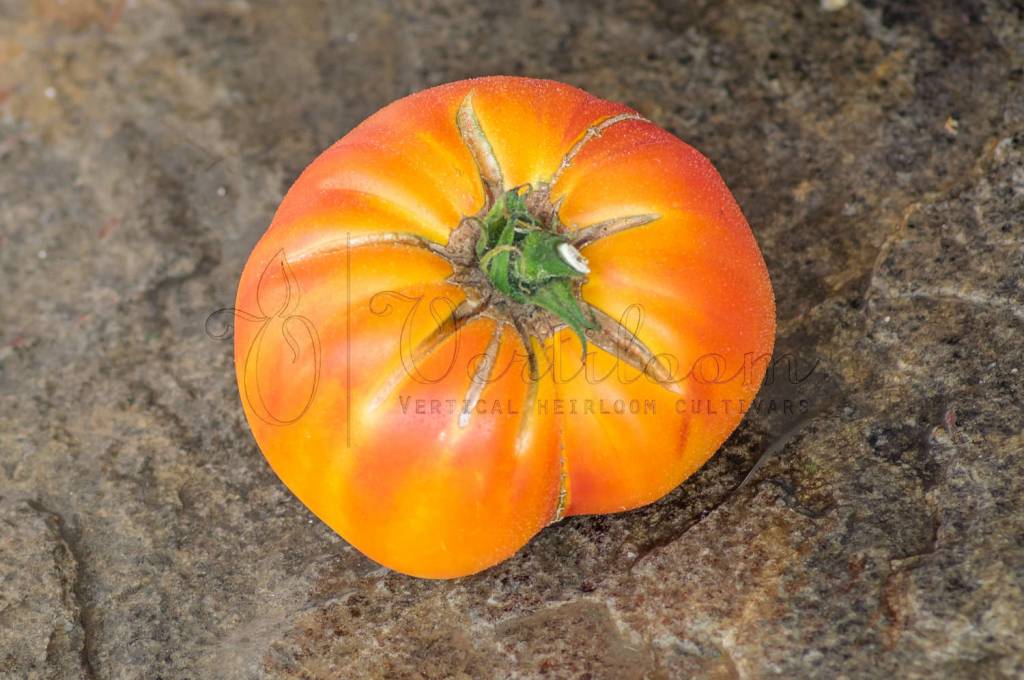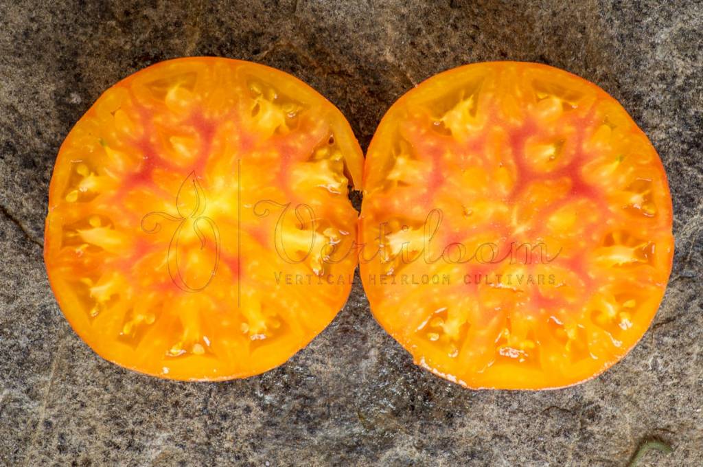 Yellow / orange beefsteak flesh marbled with pink. Deliciously soft and sweet flavor.