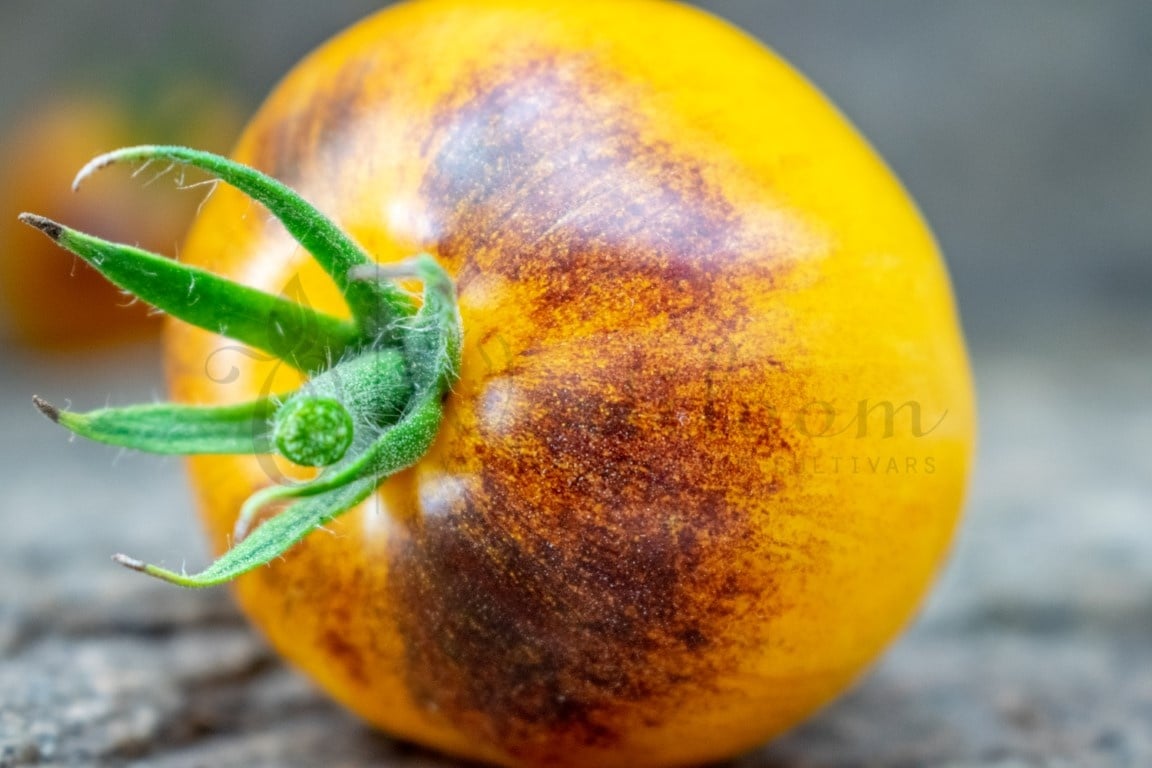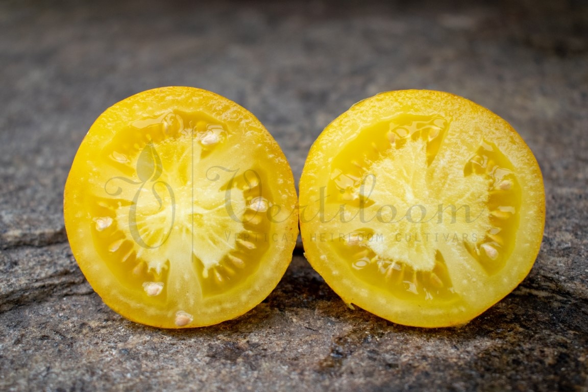Small yellow tomatoes with blue-black shoulders. On average 75 - 100 grams.