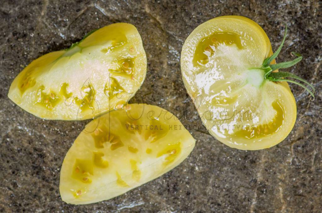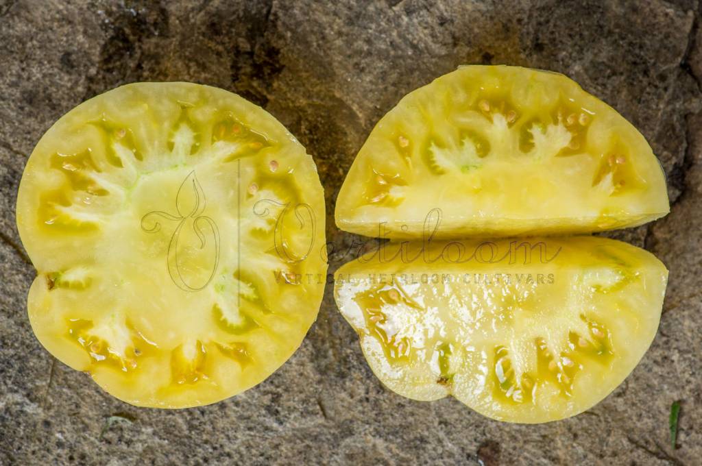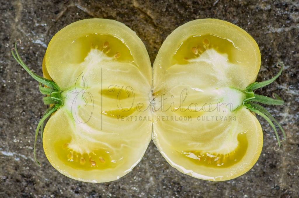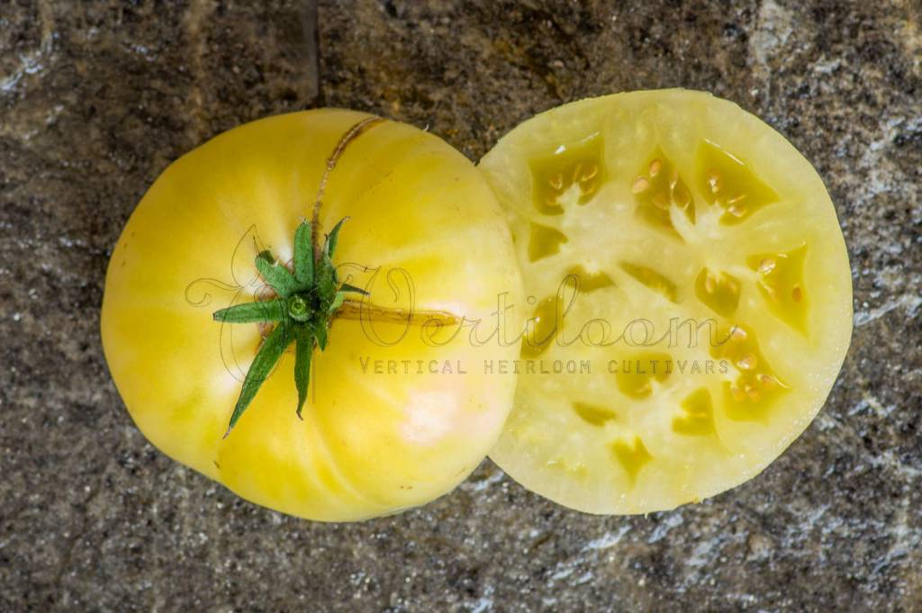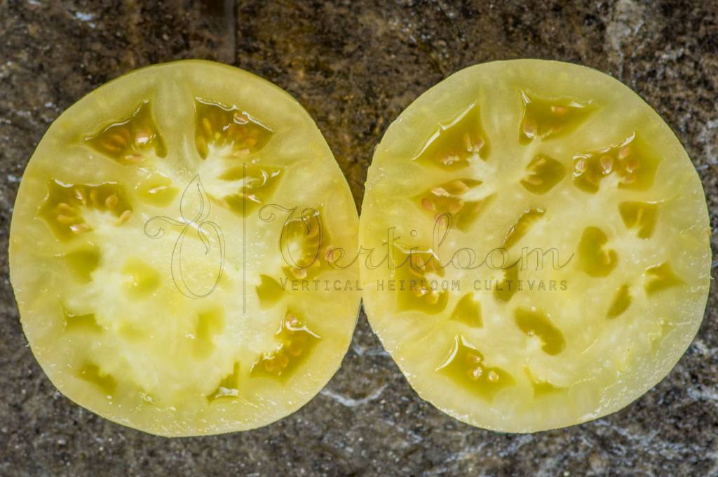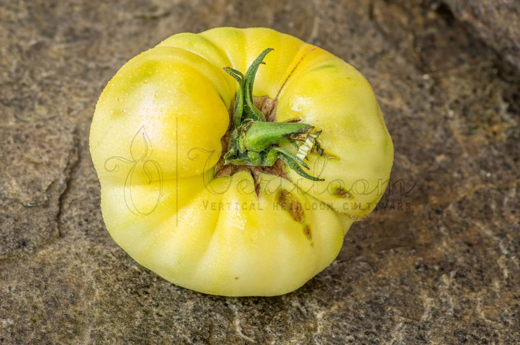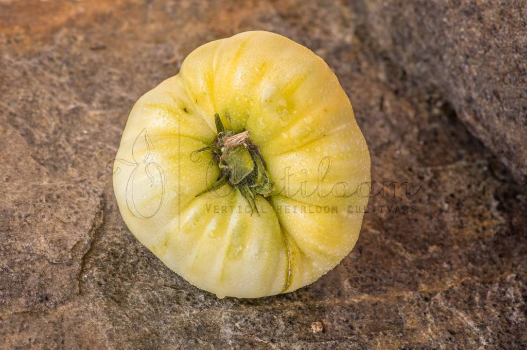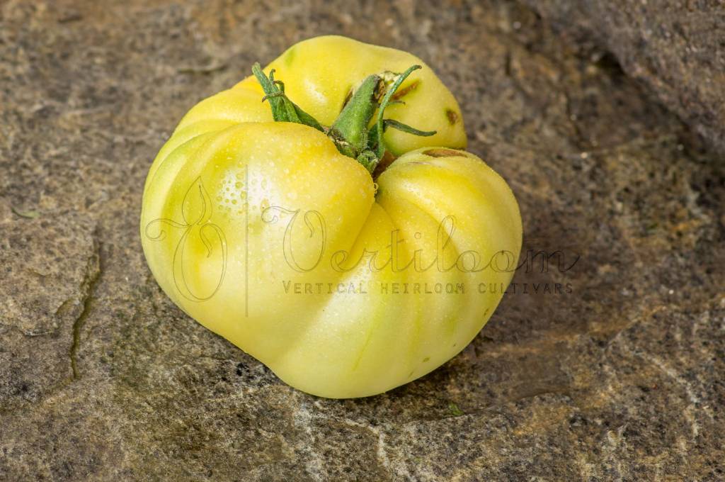 Heirloom created from the crossing of "White Beauty" and "White Tomesol", developed by Alan Bishop.