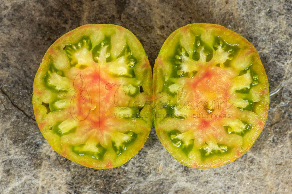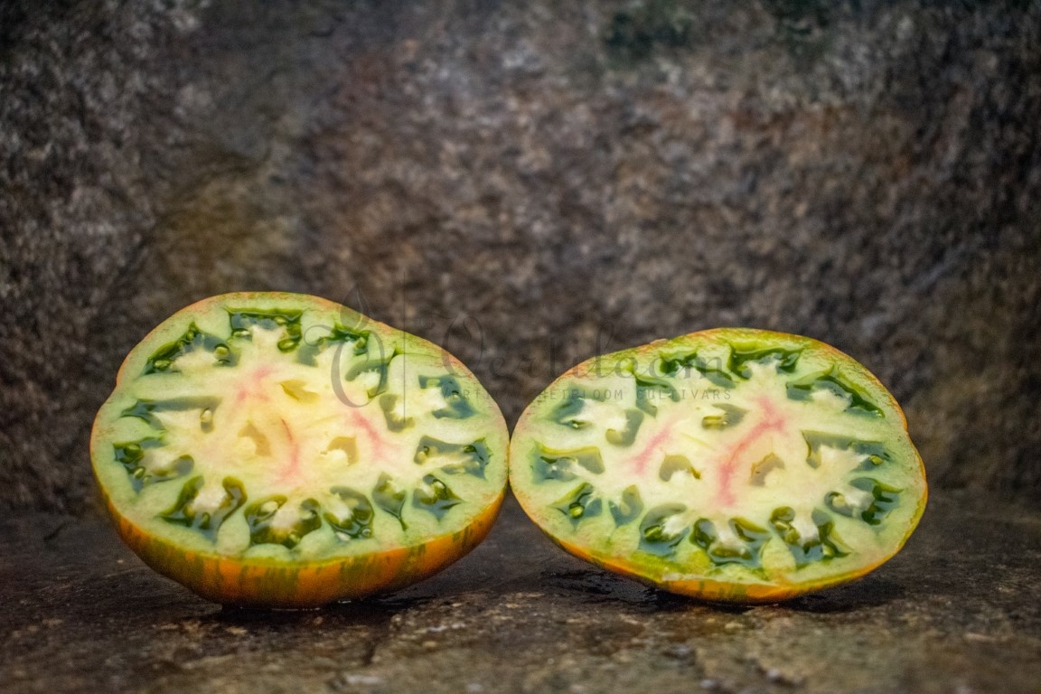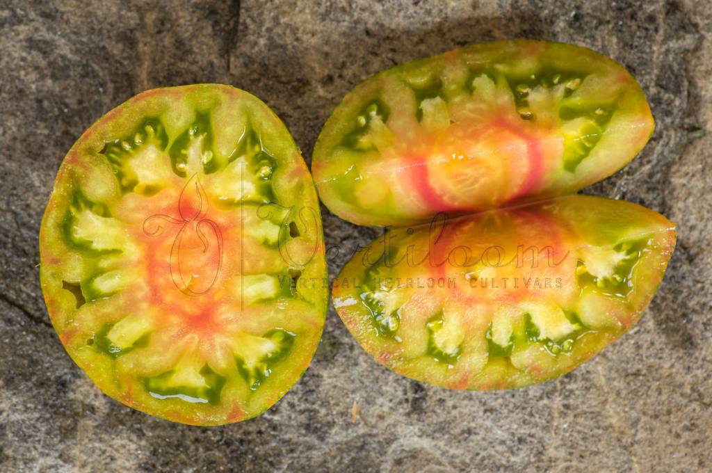 Flesh with unctuous texture, green marbled with red and yellow. Each color has its own taste that leads to a fabulous general flavormix, spicy with a hint of acidity.