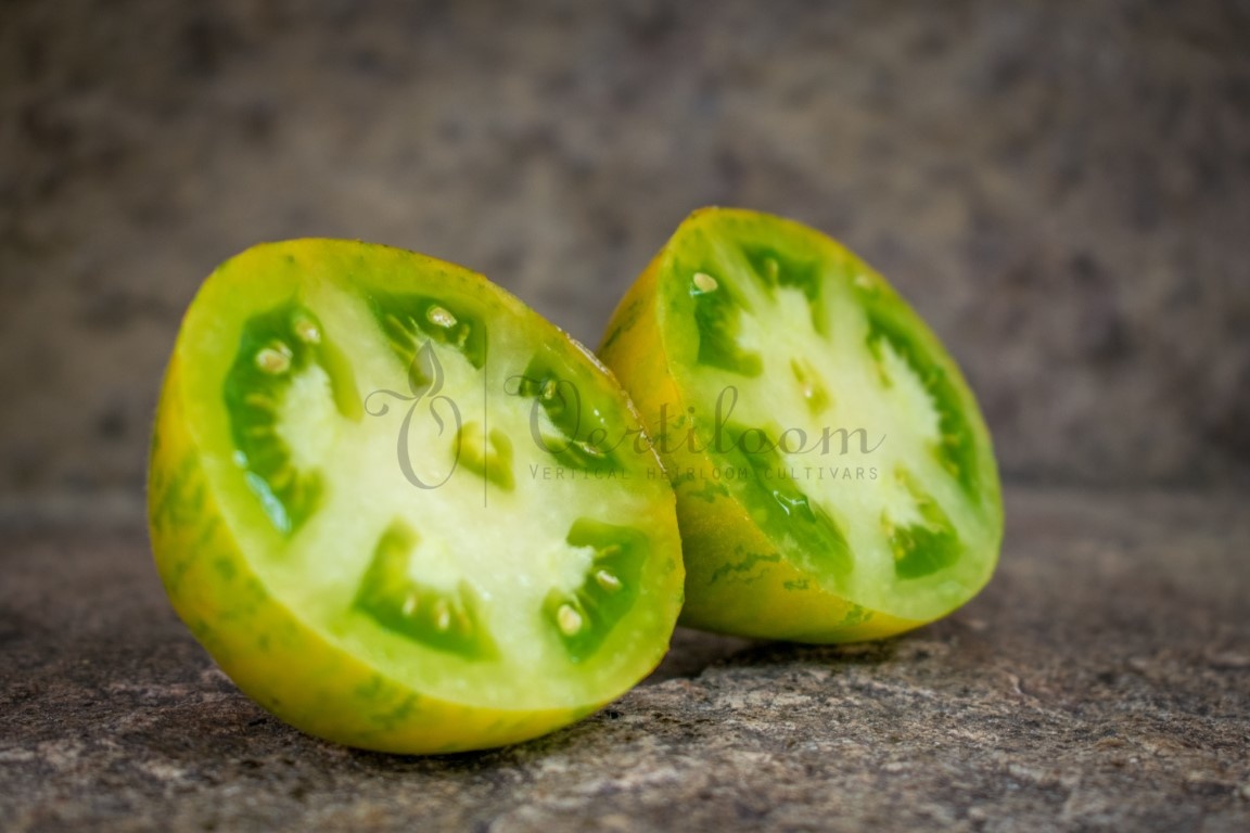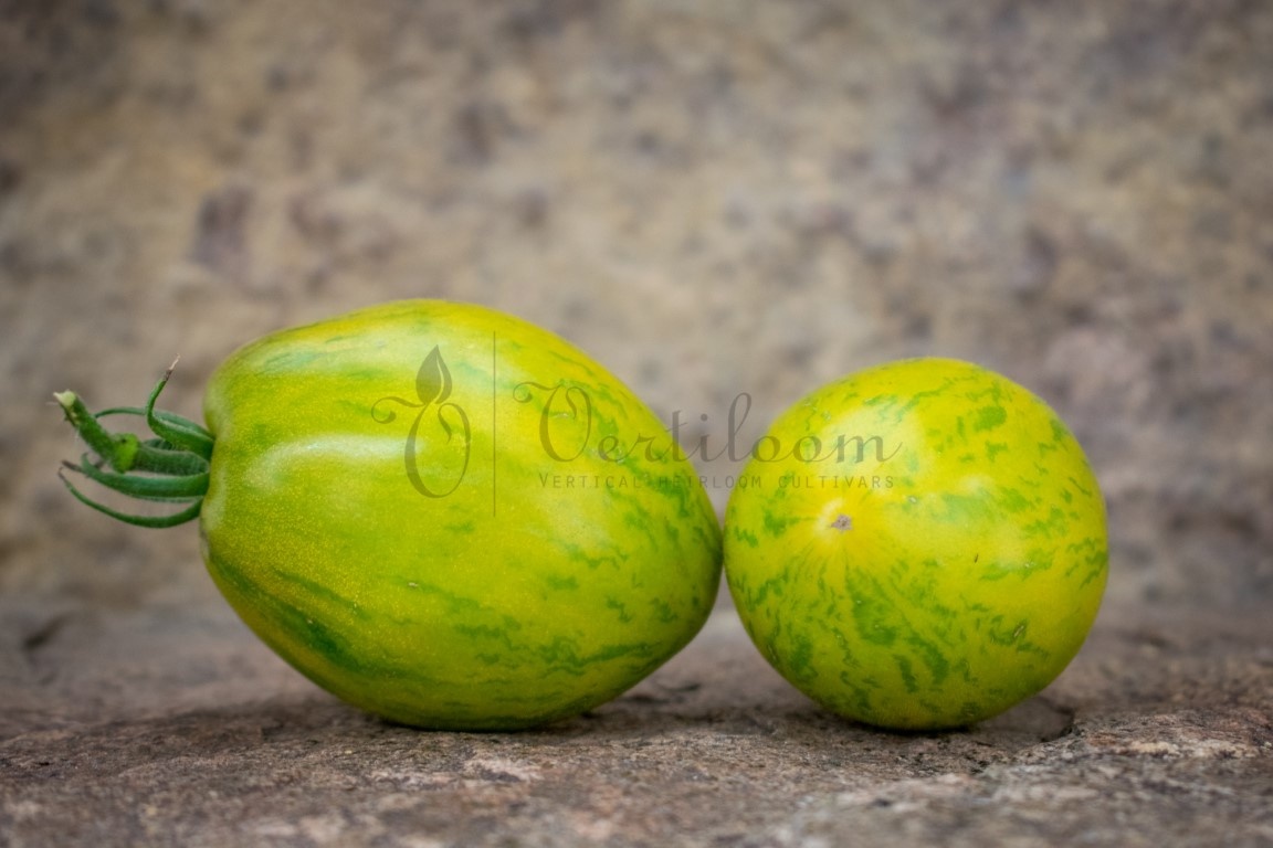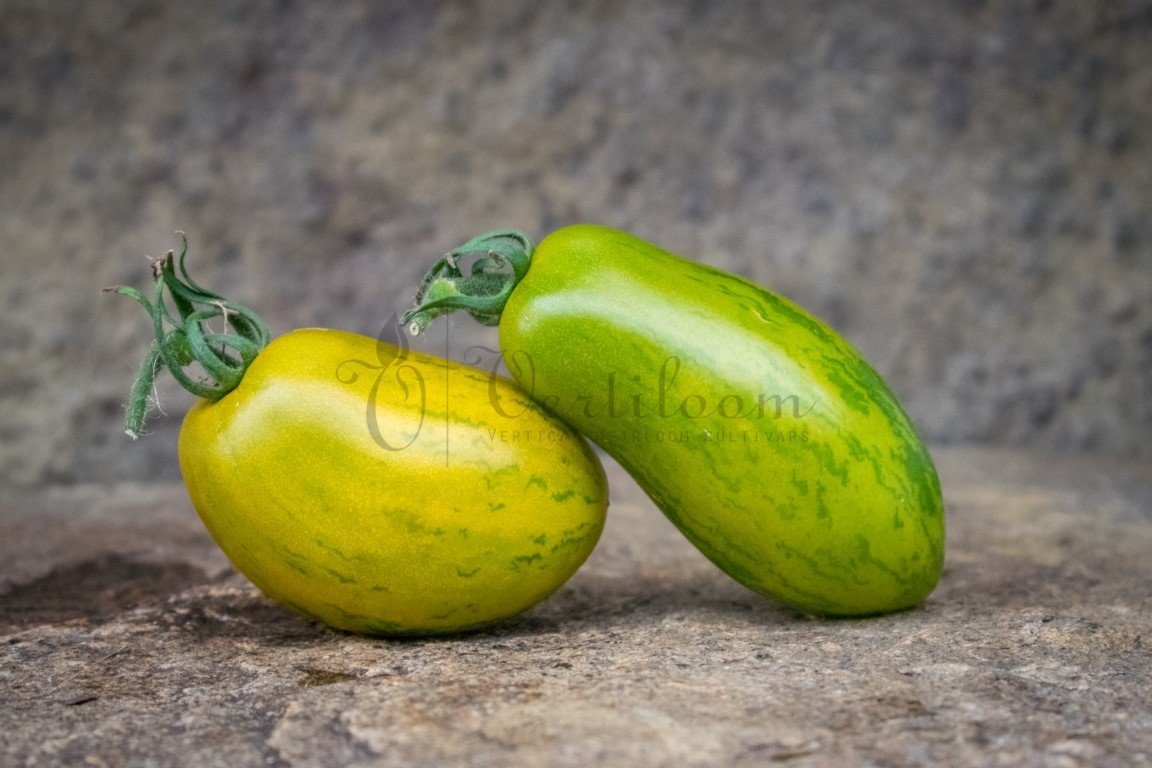 Tomates de type roma en forme de prune à peau verte, striée de vert foncé et pâle. À pleine maturité, il y a une décoloration ambrée. Poids moyen des fruits de 100 à 150 grammes.