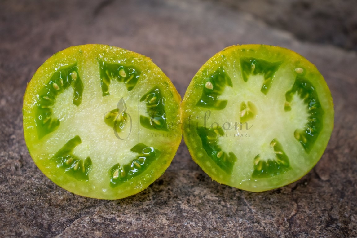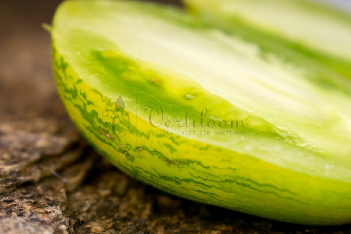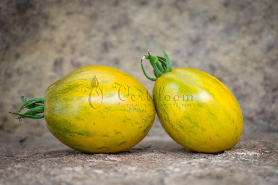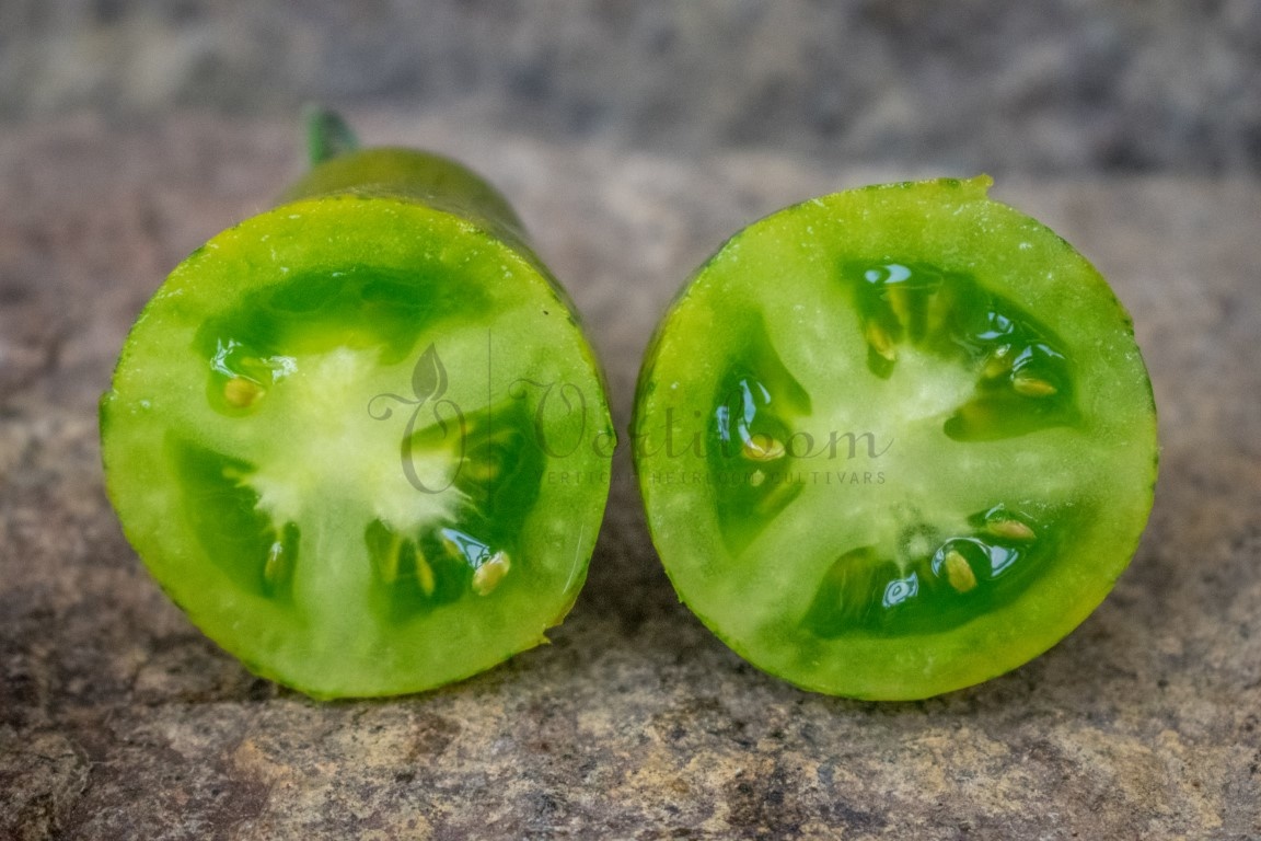 Tomates de type roma en forme de prune à peau verte, striée de vert foncé et pâle. À pleine maturité, il y a une décoloration ambrée. Poids moyen des fruits de 100 à 150 grammes.